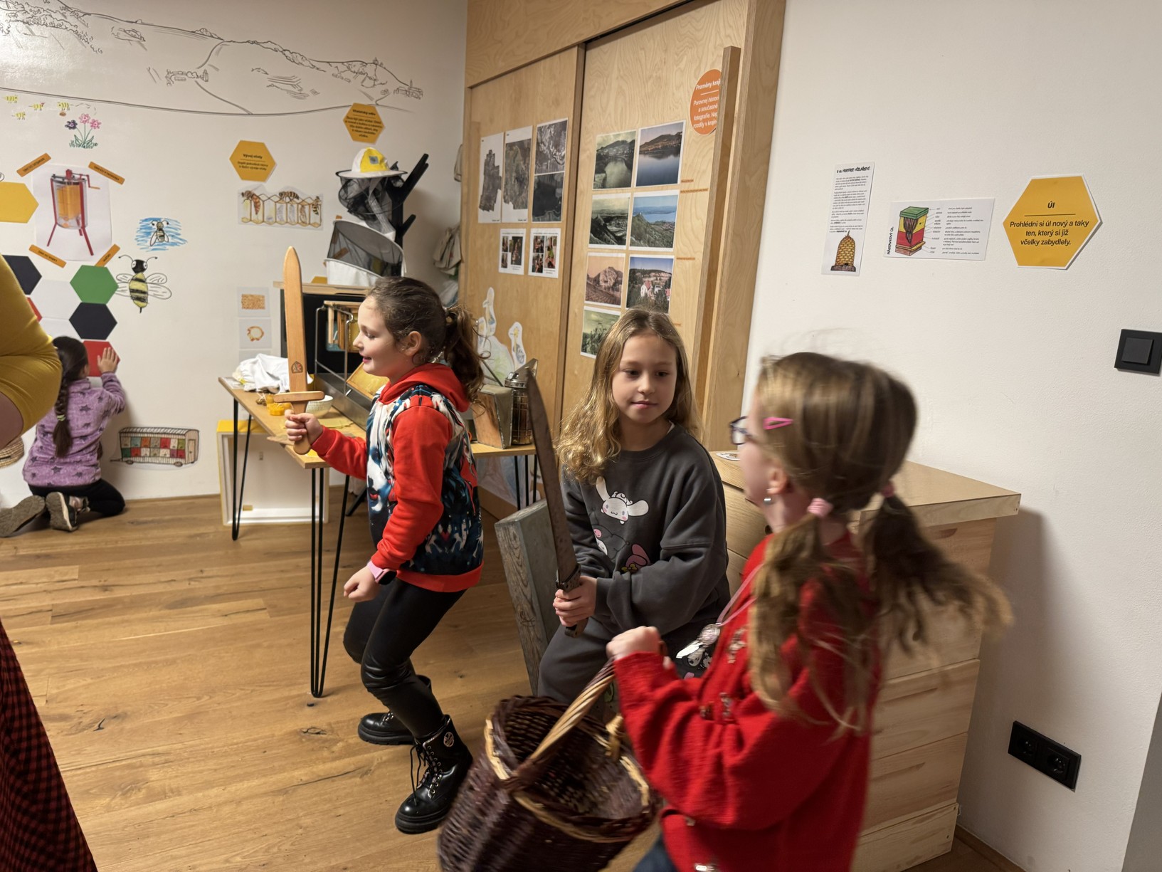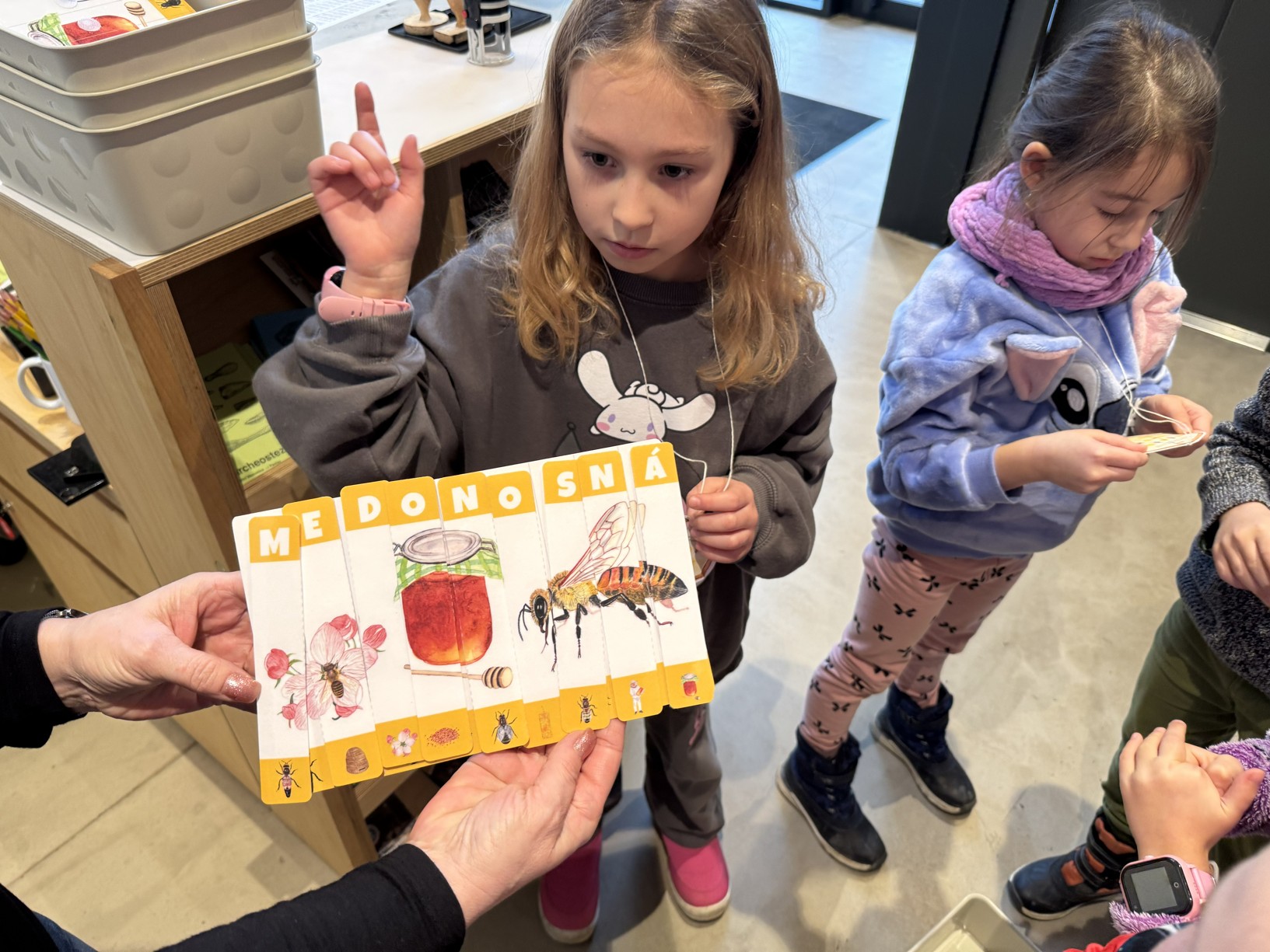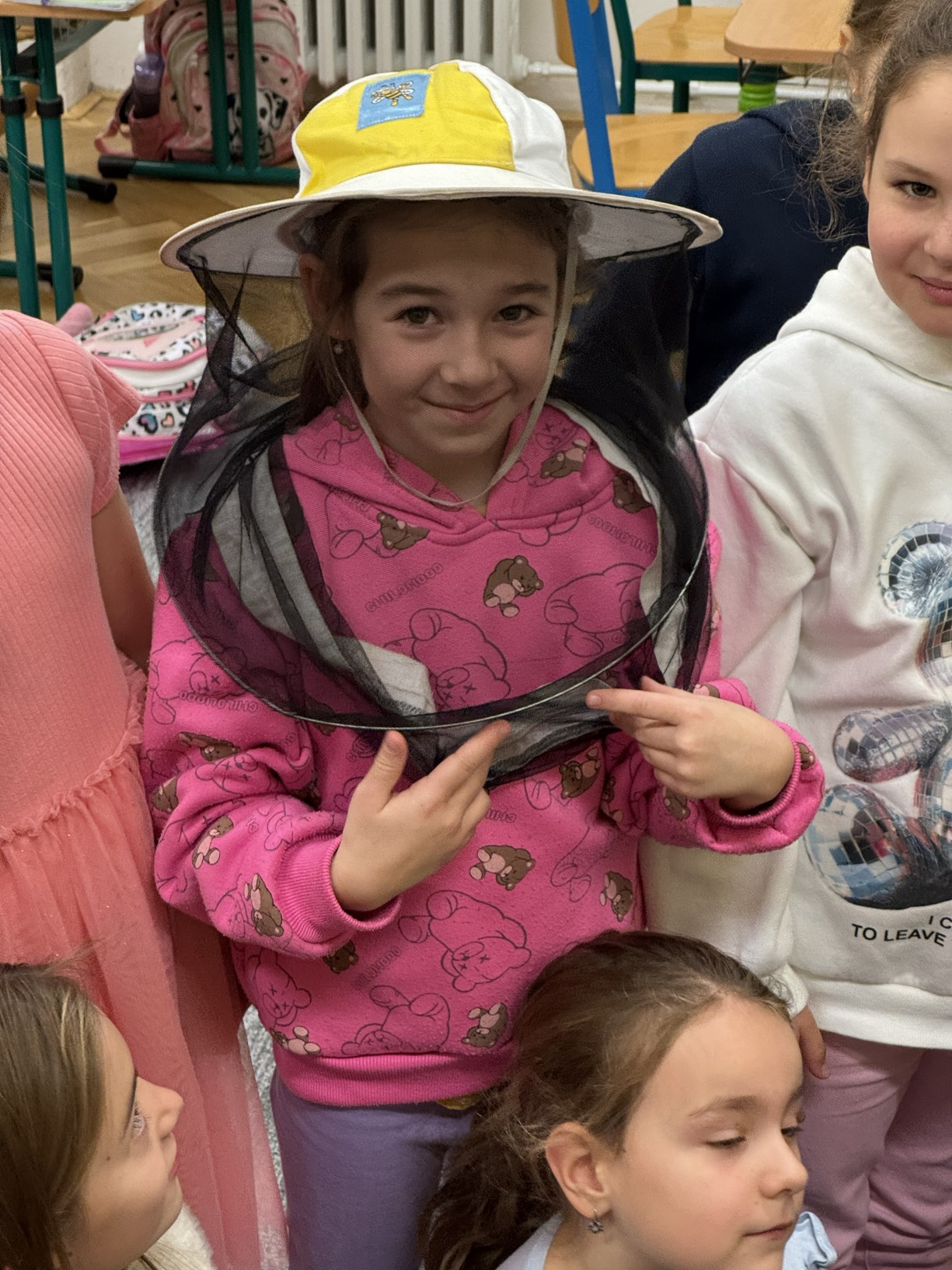 Program začal čtením příběhu o trubci Lumírovi. Na chvíli se jím stal i náš spolužák Tony. Poté nám paní ukázala pomůcky, které včelaři ke své práci potřebují. Následně jsme si vyzkoušeli, jaké to je být skutečnými včelami — byli jsme uklízečky, krmičky, stavitelky, hlídačky i nositelky pylu a nektaru.