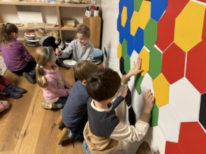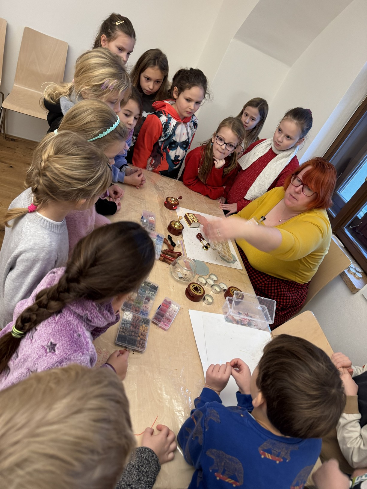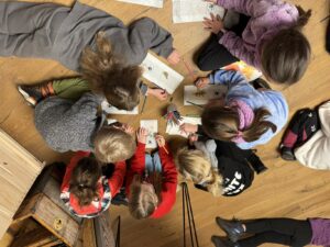 Po této pohybové hře jsme malovali pytlíčky a z včelího vosku vyráběli svíčky. Z papíru jsme si vytvořili hru Nebe, peklo, ráj a také jsme stihli vyrobit dvě pečeti — jednu pro holky a jednu pro kluky. Obě byly moc krásné.