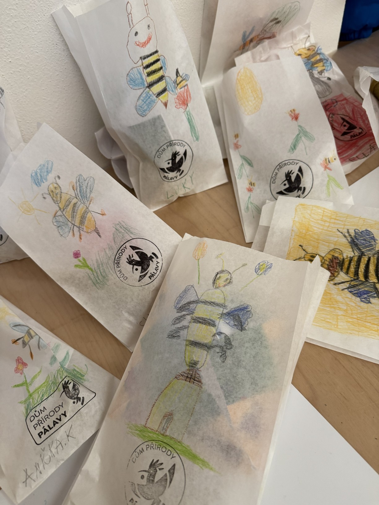 Naše nové znalosti jsme pak využili při návštěvě Domu přírody Pálavy, kde jsme jimi ohromili paní Evu Sadílkovou. Ta pro nás připravila učebnu plnou úkolů, her, aktivit a tvoření — vše na téma včely. Projekt Včely jsme zakončili malováním úlu a včel v hodinách výtvarné a pracovní výchovy.