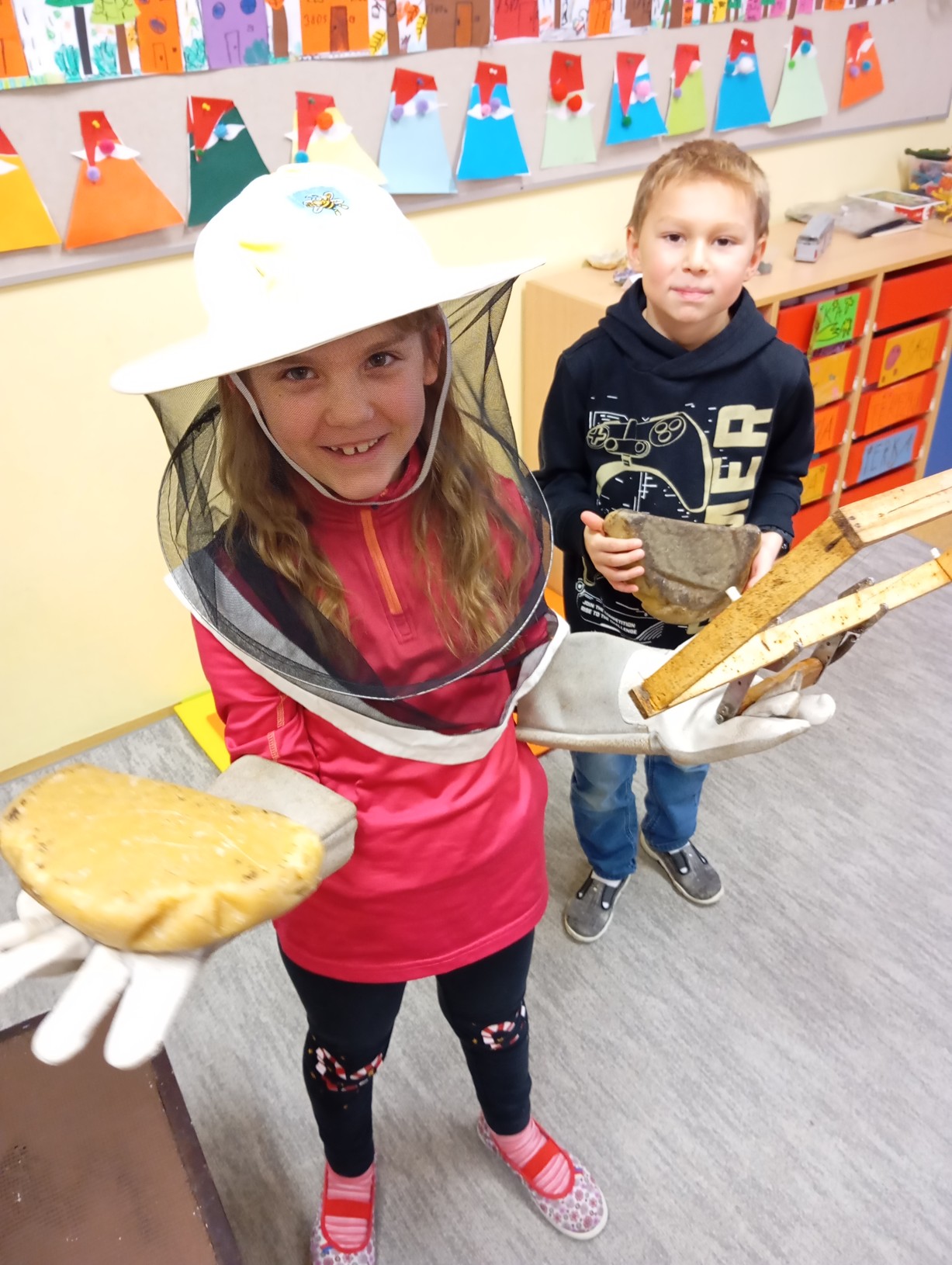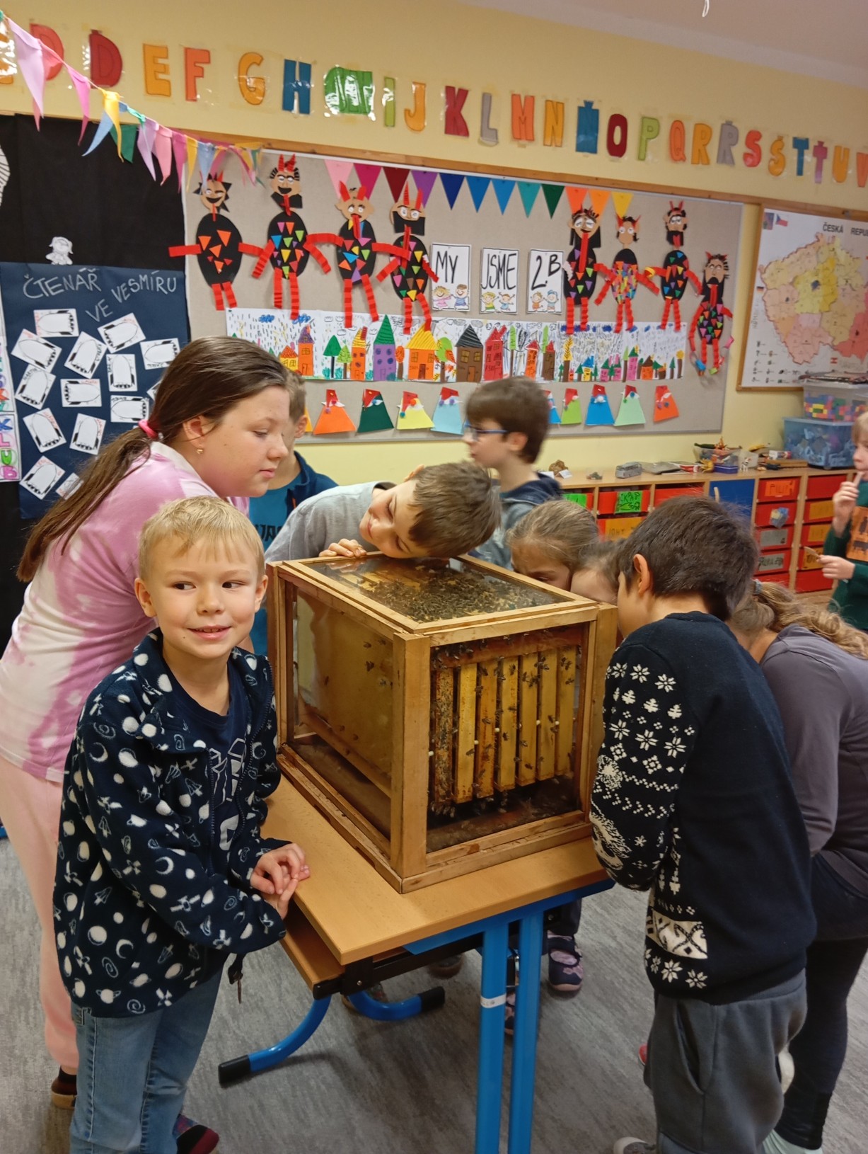 Dne 4. prosince 2025 nás ve druhých třídách navštívil včelař pan Mgr. Tomáš Gabriel Roblík z Újezdu u Brna, který se věnuje chovu včel a ochraně včelstev. Přišel k nám na besedu o těchto malých a velmi důležitých tvorech. Přinesl si úl bez včelek, kde dětem ukazoval rámky s voskem a vysvětloval, jak včelky pracují a co v rámcích dělají. Půjčil žákům i včelařskou výbavu jako je kukla, kleště na rámky, dýmák i rukavice. Hlavně nám však přinesl ještě jeden úl s živým včelstvem. Včeličky byly pod sklem ze všech stran, a tak na ně děti pěkně viděly. Mohly si prohlédnout jejich hemžení, poslechnout bzučení, líhnutí mladušky i systém v jakém se pohybují. Včelí královna byla uvnitř a zvnějšku jsme viděli samé pilné dělnice. Děti měly na pana včelaře i zajímavé otázky a on jim ke konci besedy dal ochutnat pravý včelí med jako sladkou tečku za touto návštěvou.