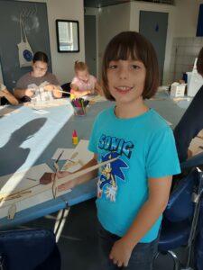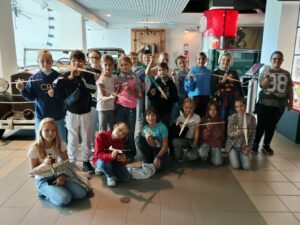 Třešničkou na dortu naší návštěvy však byla výtvarně-technická dílna, kde jsme si vyrobili vlastní dřevěné letadlo. Výroba byla ale náročná. Letadlo jsme museli dlouho brousit smirkovými papíry a pilníky, aby do sebe jednotlivé díly zapadly. Ty jsme pak museli slepit a trpělivě čekat, až lepidlo zaschne. Pomocí kladívek jsme následně připevnili na špičku závaží. Nakonec jsme si letadlo pokreslili podle vlastní fantazie a zůstane nám jako připomínka hezkého dne. Doufáme, že se do muzea zase někdy podíváme.