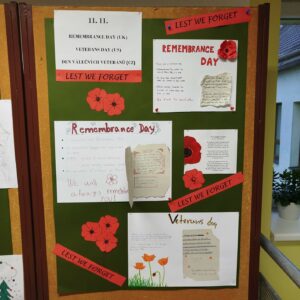 Ve volitelné angličtině jsme se s žáky věnovali tématu Dne válečných veteránů (Veterans Day/Remembrance Day), který si celý svět připomíná 11. listopadu. Povídali jsme si o tom, proč je tento den důležitý, kdo jsou veteráni a co znamená symbol vlčího máku. Na závěr žáci vytvořili plakát a napsali báseň, kterou věnovali všem, kdo v minulosti sloužili své zemi.