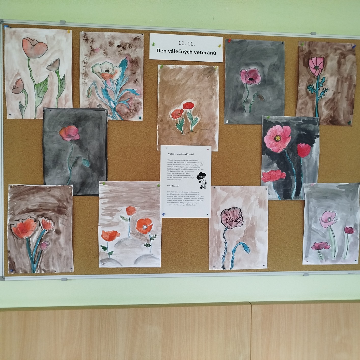 Ve výtvarné výchově se k tématu připojila i 6. D, která vytvořila krásné výkresy s motivem červeného vlčího máku. Všechny práce společně připomínají úctu, vděčnost a mír, který není samozřejmostí.