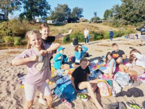 U splavu na pláži jsme si rozložili piknikové deky, děti s sebou měly spoustu dobrůtek, připravila jsem jim i vafle se šlehačkou. Protože nám přálo počasí, užili jsme si i stavění různých mostů ve vodě a brouzdání v řece. Nakonec jsme si zahráli pétanque, který některé děti velice bavil.