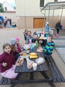 Odpoledne jsme společně strávili venku, kde si děti opekly špekáček, zatančily si a zahrály různé míčové hry. A jako odměna nás čekalo i překvapení – na obloze se objevila nádherná duha, která všechny potěšila.