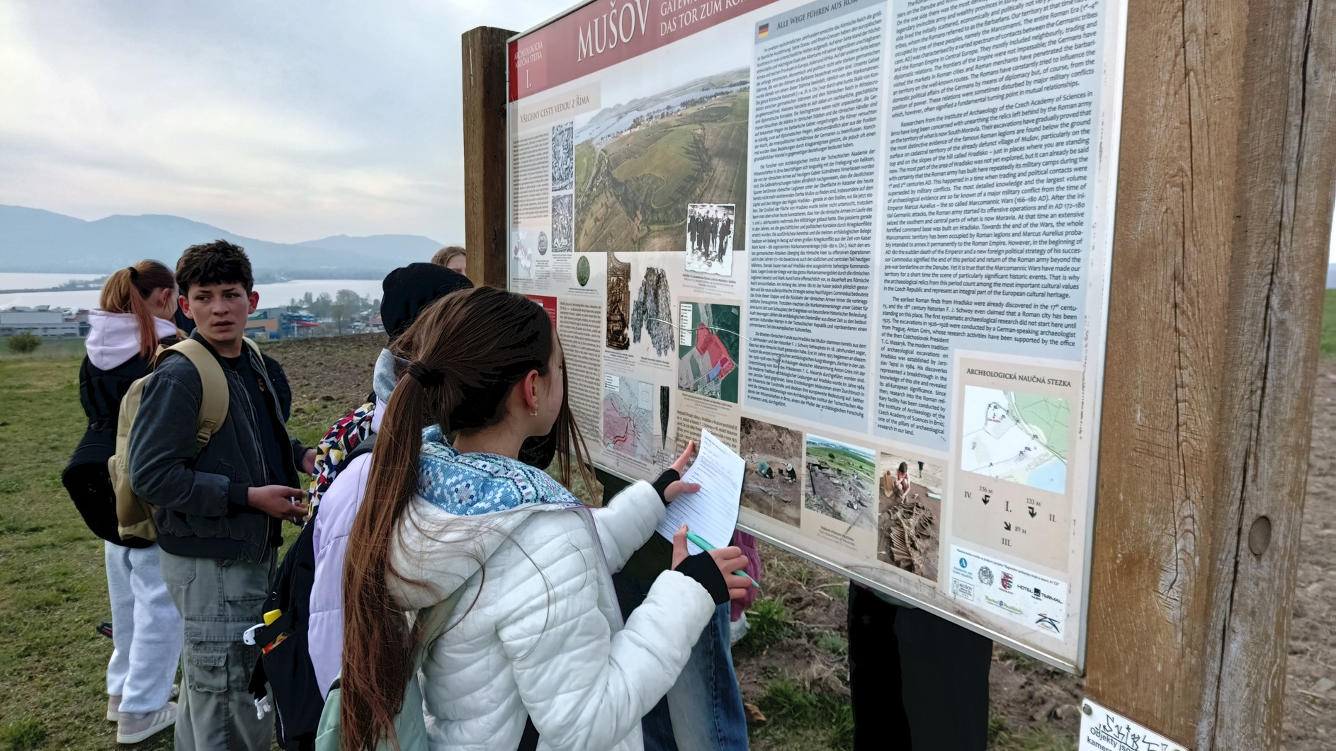 V rámci výuky dějepisu se žáci 6. C vydali po stopách Římanů na kopec Hradisko nad Pasohlávkami. Nejprve si prošli naučnou stezku vedoucí na samotný kopec, kde se před téměř dvěma tisíci lety rozkládal římský vojenský tábor. Během výšlapu tak mohli ocenit strategický význam místa, které nabízí rozhled do širokého okolí.