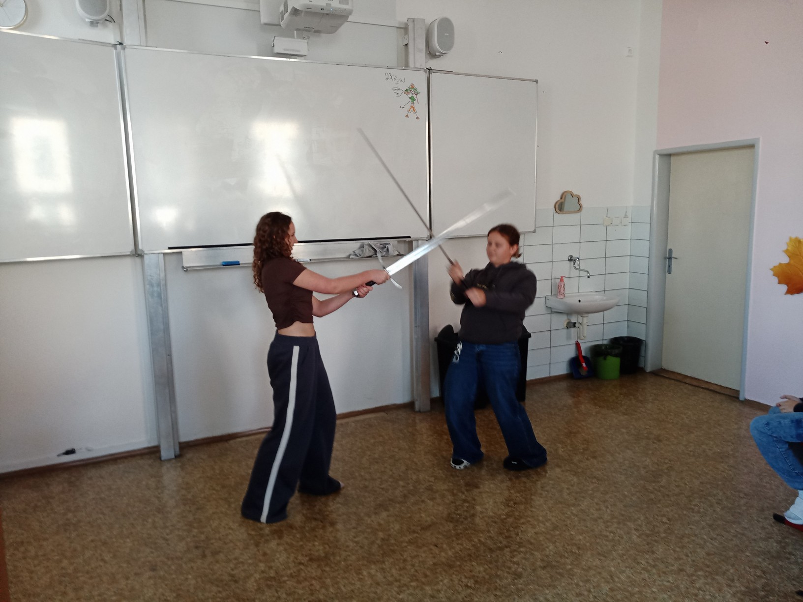 Dobrovolníci pak na sebe s pomocí spolužáků oblékli brnění vážící dohromady přibližně dvanáct kilogramů a odvážlivci si vyzkoušeli souboje s meči. Navzdory malým šermířským zkušenostem a často až příliš velkému bojovému odhodlání se vše obešlo bez zranění.