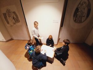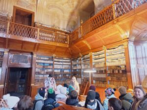 Chladnými klášterními chodbami plnými subtropických rostlin (oleandry, kamélie, olivovníky) jsme se dostali do příjemně vytopeného sálu, kde děti začaly plnit zadané úkoly týkající se práce v knihovně. Hrály pantomimu, rozřazovaly knihy podle žánrů, ve skupinkách vyplňovaly katalogizační lístky podle různých knih, přiřazovaly obrázky známých historických budov.