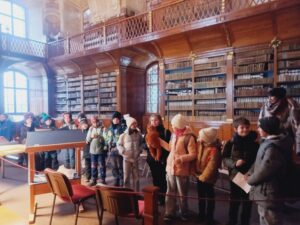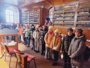 Zlatým hřebem programu byla prohlídka historické benediktinské knihovny s více než 65 000 svazky. Děti zde obdivovaly obrovský mechanický glóbus, hodiny se šestnácti ciferníky, vysoké dřevěné skříně a police se starými knihami i nádhernou fresku na stropě. Nejvíce je ale zaujal tajný vchod, který se otevírá skrytou páčkou, knihovník se tak dostane na točité schodiště vedoucí do druhého patra barokní knihovny.